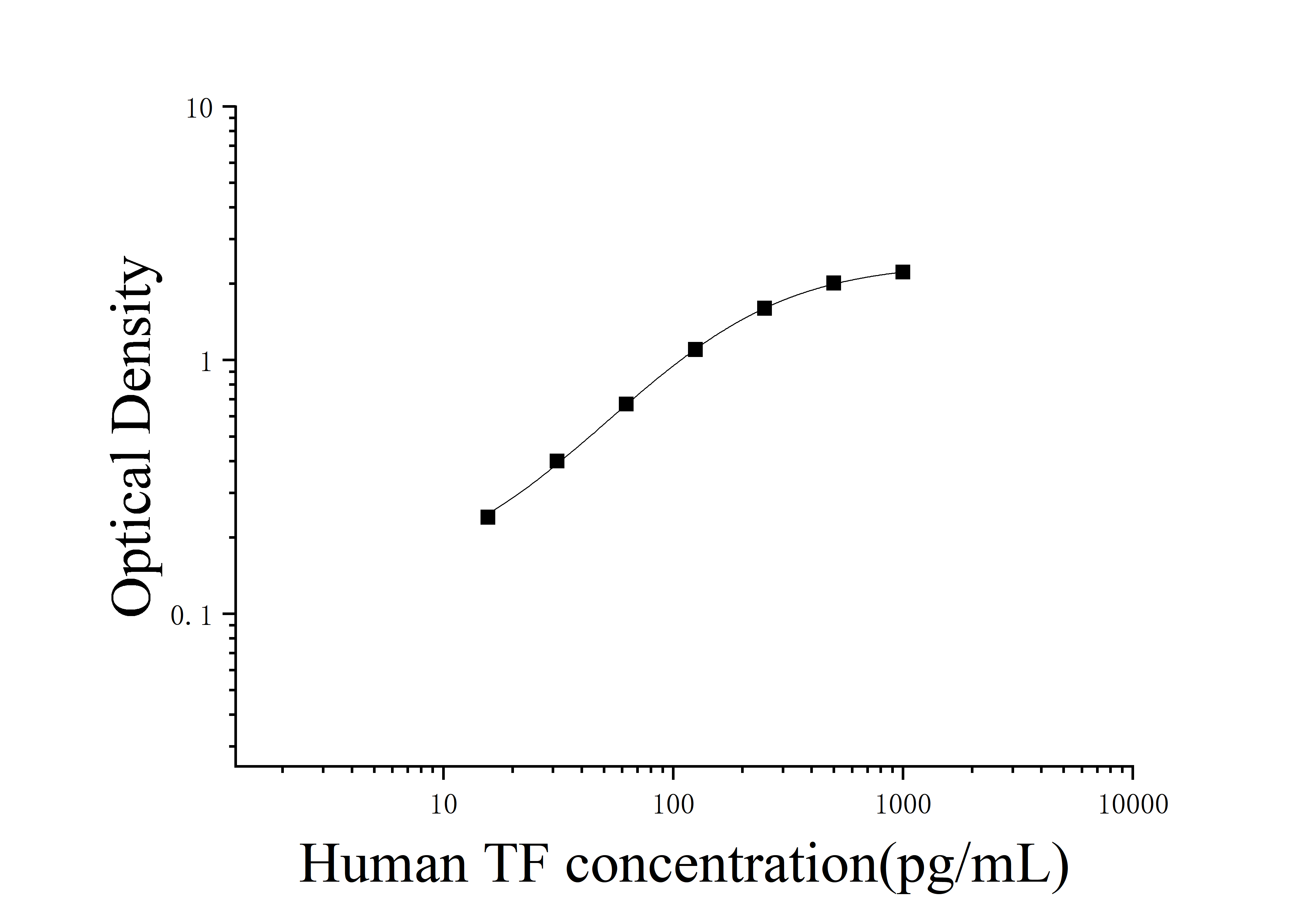 由于实验操作条件的不同( 如操作者、移液技术、洗板技术和稳定条件等),标准曲线的OD值会有所差异。以下数据和曲线仅供参考,实验者需根据自己的实验建立标准曲线。