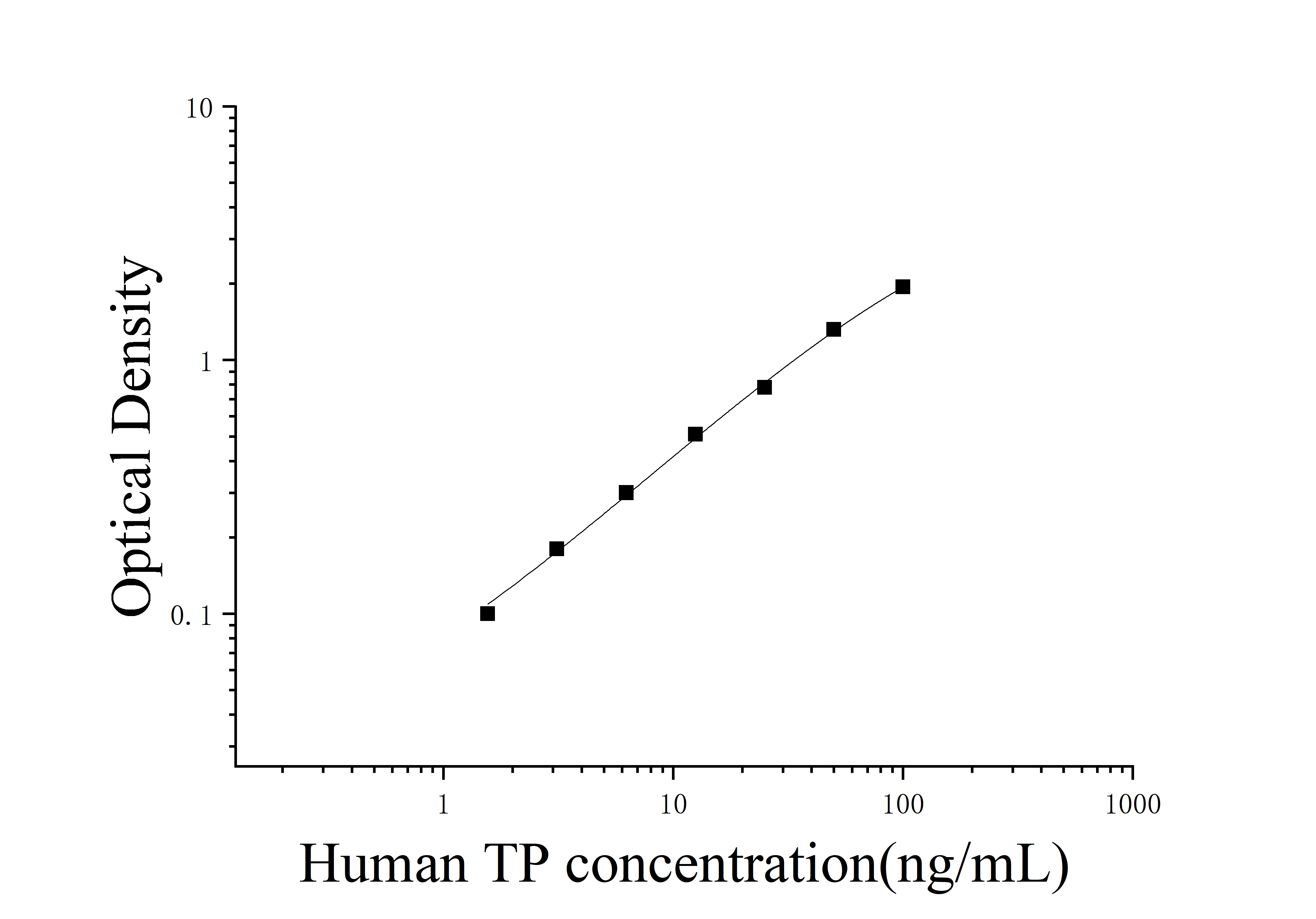 由于实验操作条件的不同( 如操作者、移液技术、洗板技术和稳定条件等),标准曲线的OD值会有所差异。以下数据和曲线仅供参考,实验者需根据自己的实验建立标准曲线。